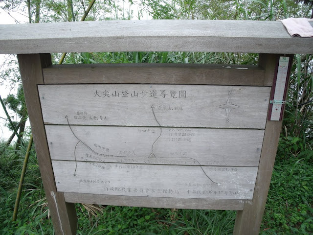 這次和第一次來爬一樣,全程共耗時1小時40分鐘,步道長度約7.4K , 總爬升高度約625米,山頂有環形的休息平台&一等三角點以及一個木造的大尖山登山路線示意圖。